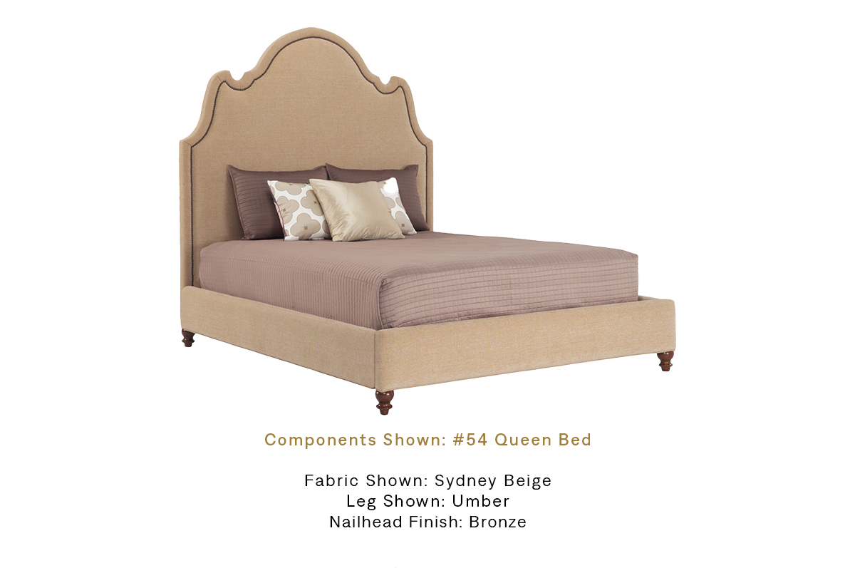 The Amelia traditional fully upholstered bed features side rails and a footboard with a sculptural top outlined in small nailheads and finished with small exposed wood legs for a classic, elegant touch.