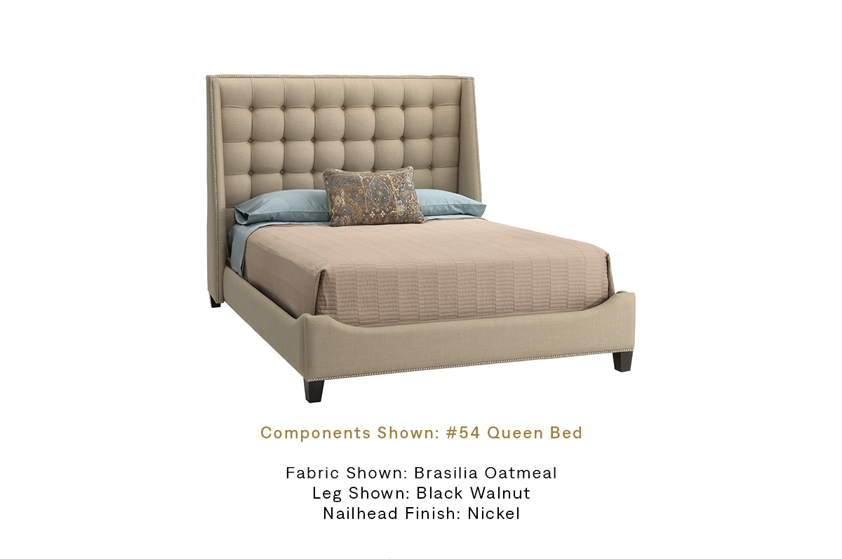 The Irina transitional fully upholstered bed features a tall tufted back with small wings, sculpted side rails, and footboard. Tapered exposed legs offer a refined and elegant look.