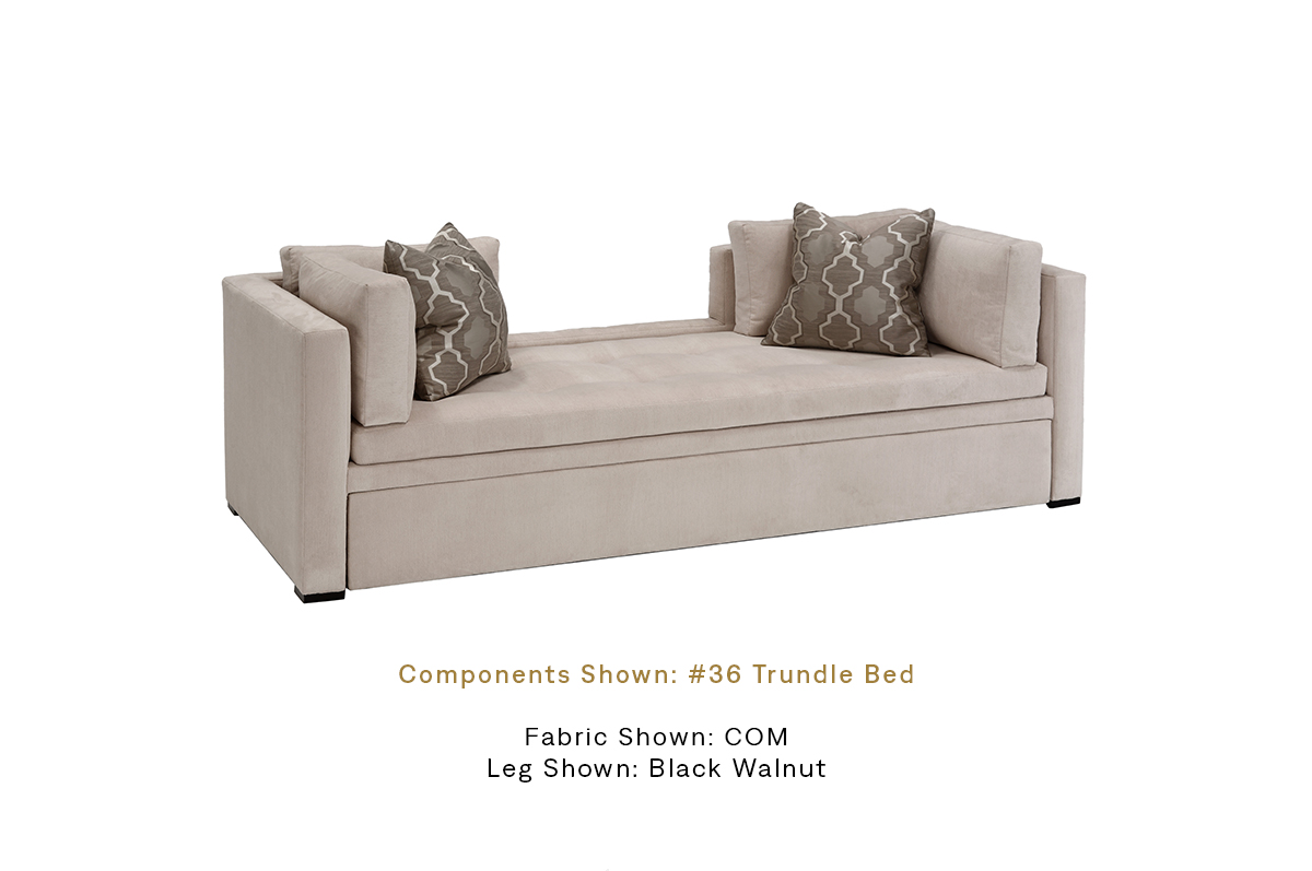 The Mercer contemporary trundle bed features track arm styling with a cut-out area on the inside back, side pillows, buttoned seats, and small exposed block legs for a stylish, functional design.