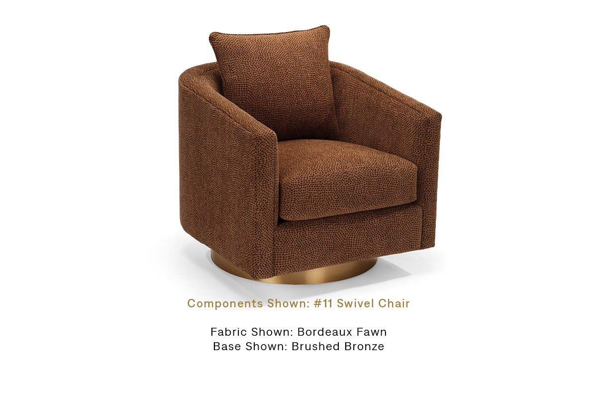 The Ally swivel chair combines classic elegance with a loose seat and back pillow, available with either a wood base or a metal veneer option.