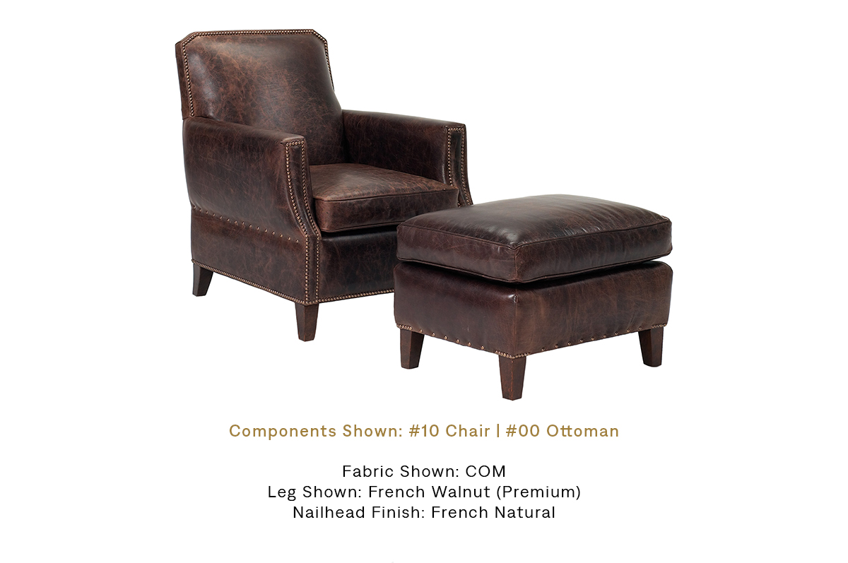 The Henry club chair exudes classic Art Deco elegance with its decorative nailhead trim and exposed wood legs. A matching ottoman is also available to complete the look.