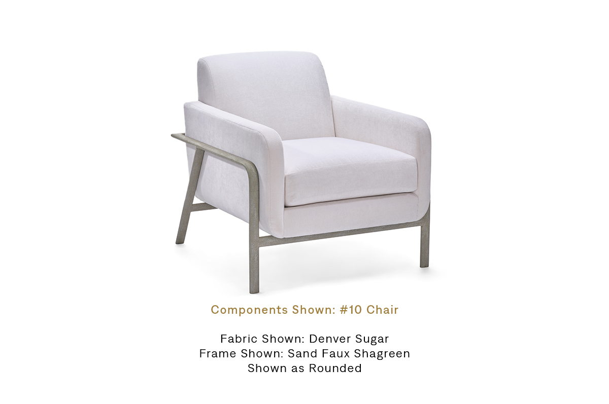 The Lawson Chair features a striking metal frame with a luxurious shagreen finish, complemented by a variety of upholstered interior options for a customized, sophisticated look.