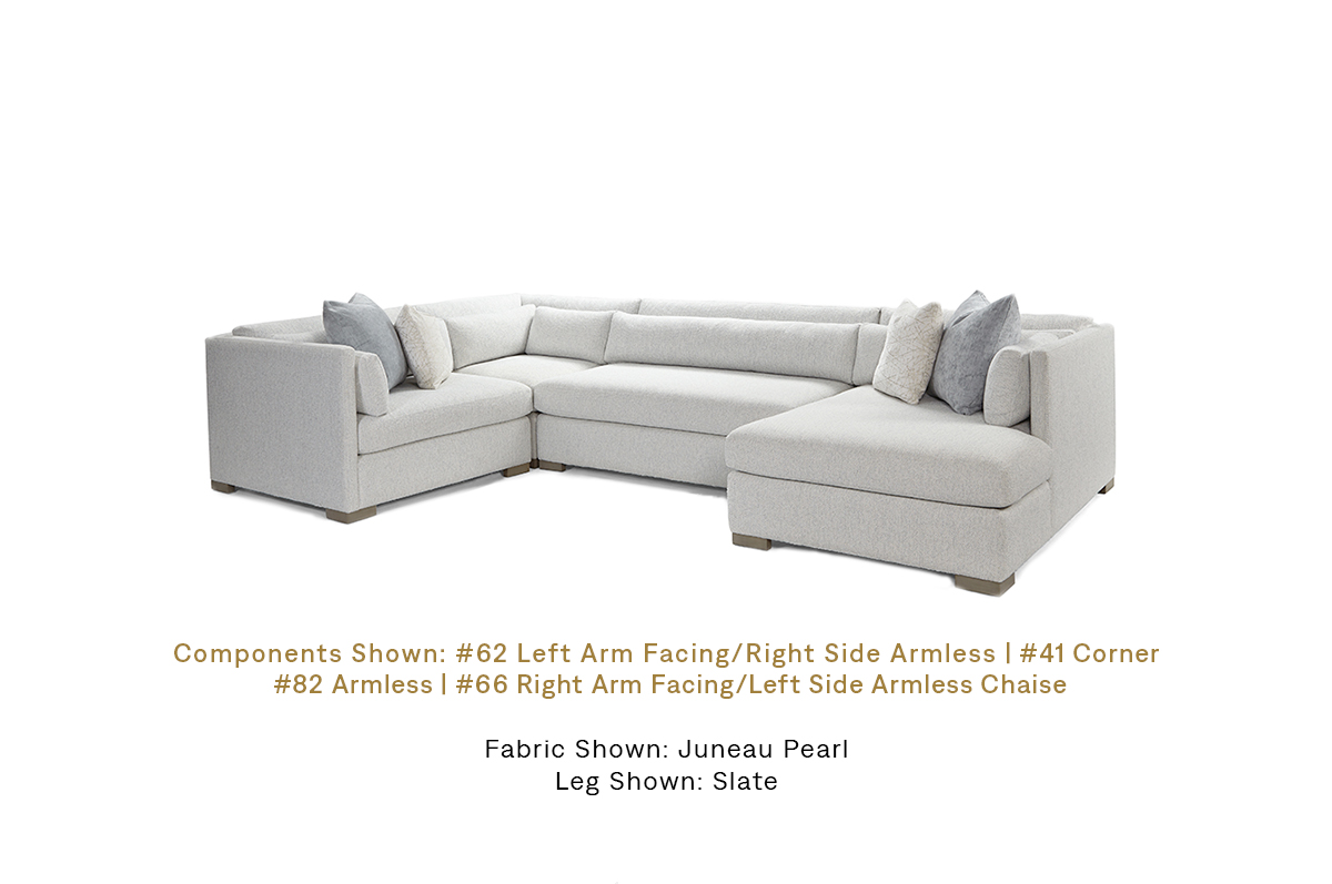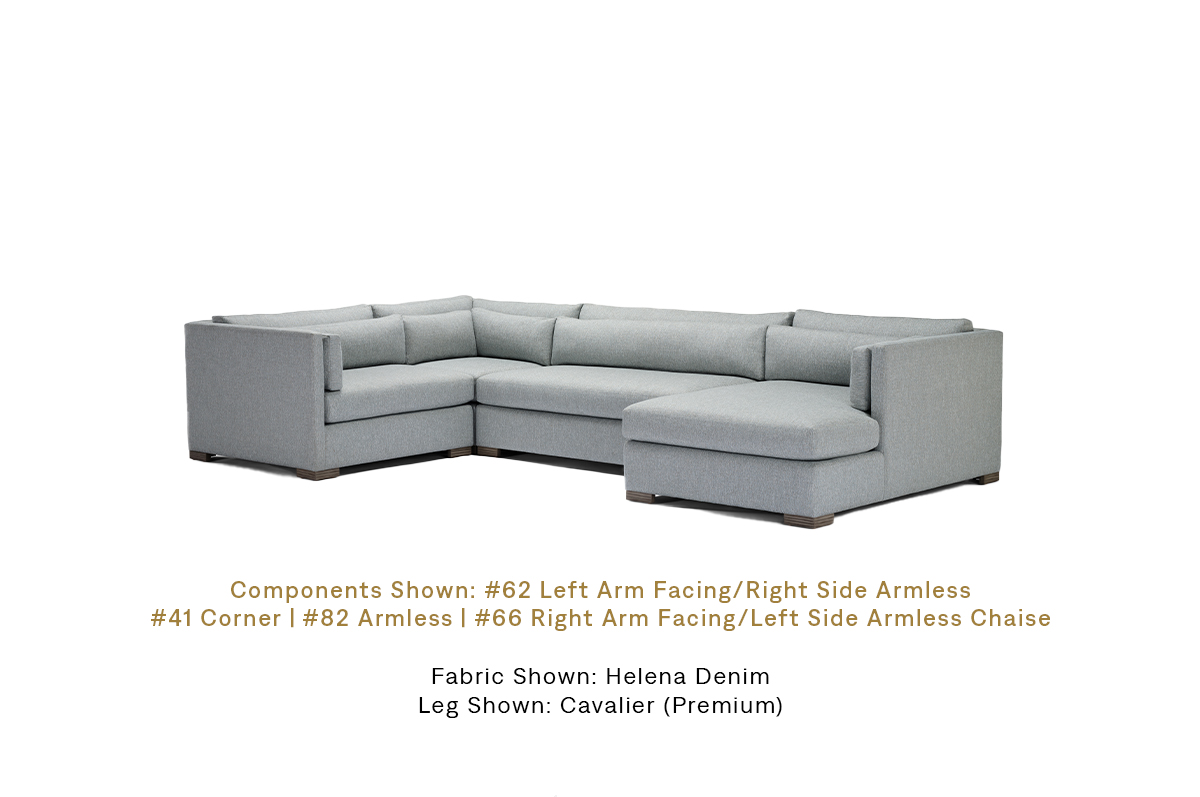 The Desmond modern modular sectional series features a shelter frame with thin track arms, loose seat and back cushions, and long lumbar pillows for a casual, comfortable look. Exposed wood legs complete the design.