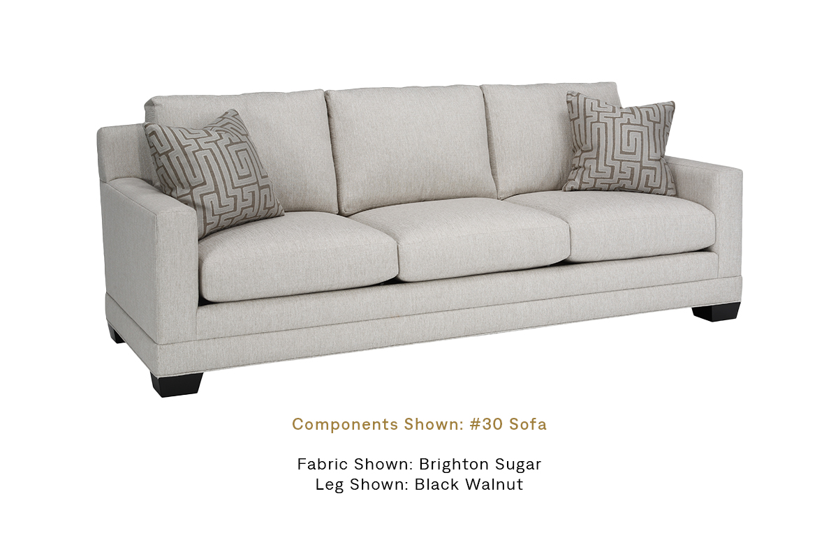 The Samuel classic transitional track arm sofa features banded detailing on the base and wide tapered block legs.