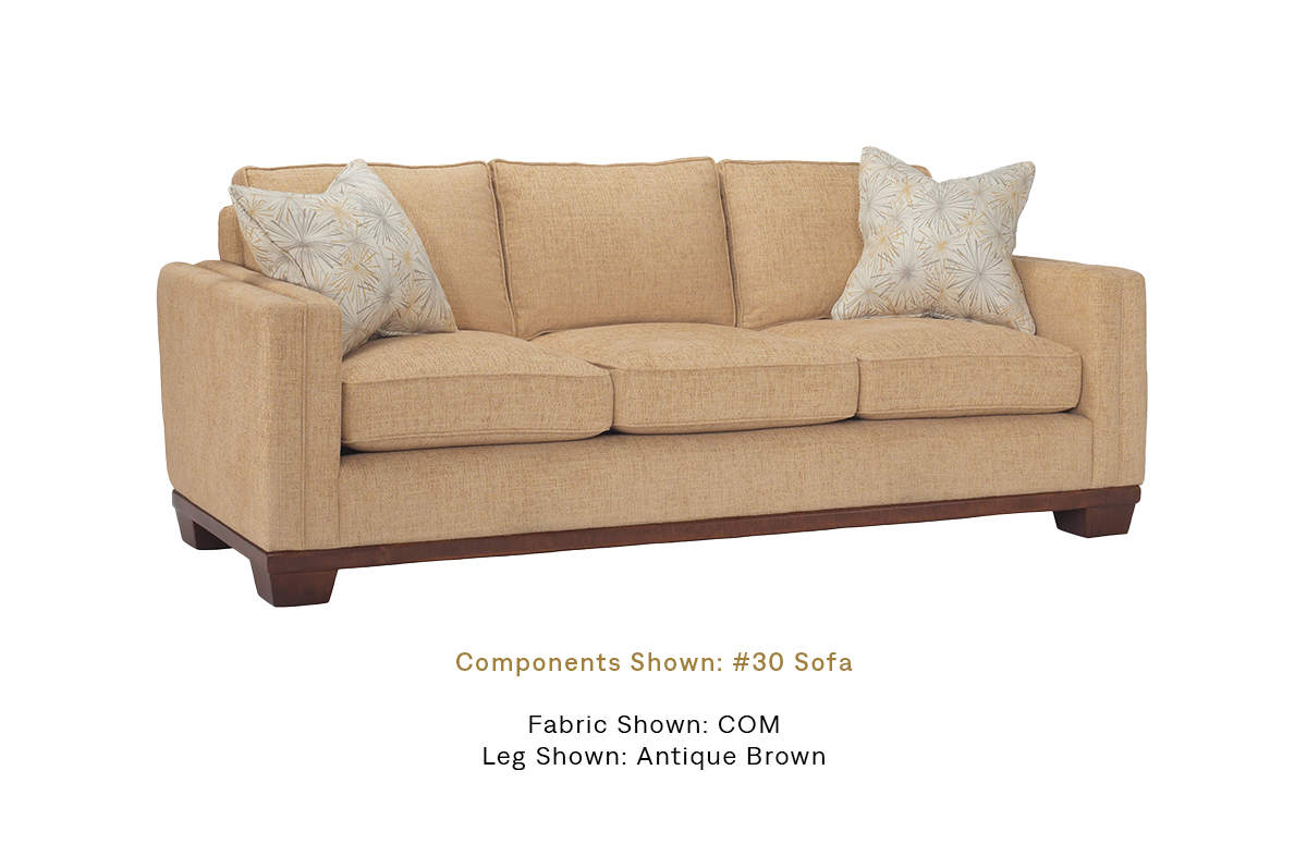 The Teddy transitional sofa is complemented by a substantial wood base and inset tapered block legs.