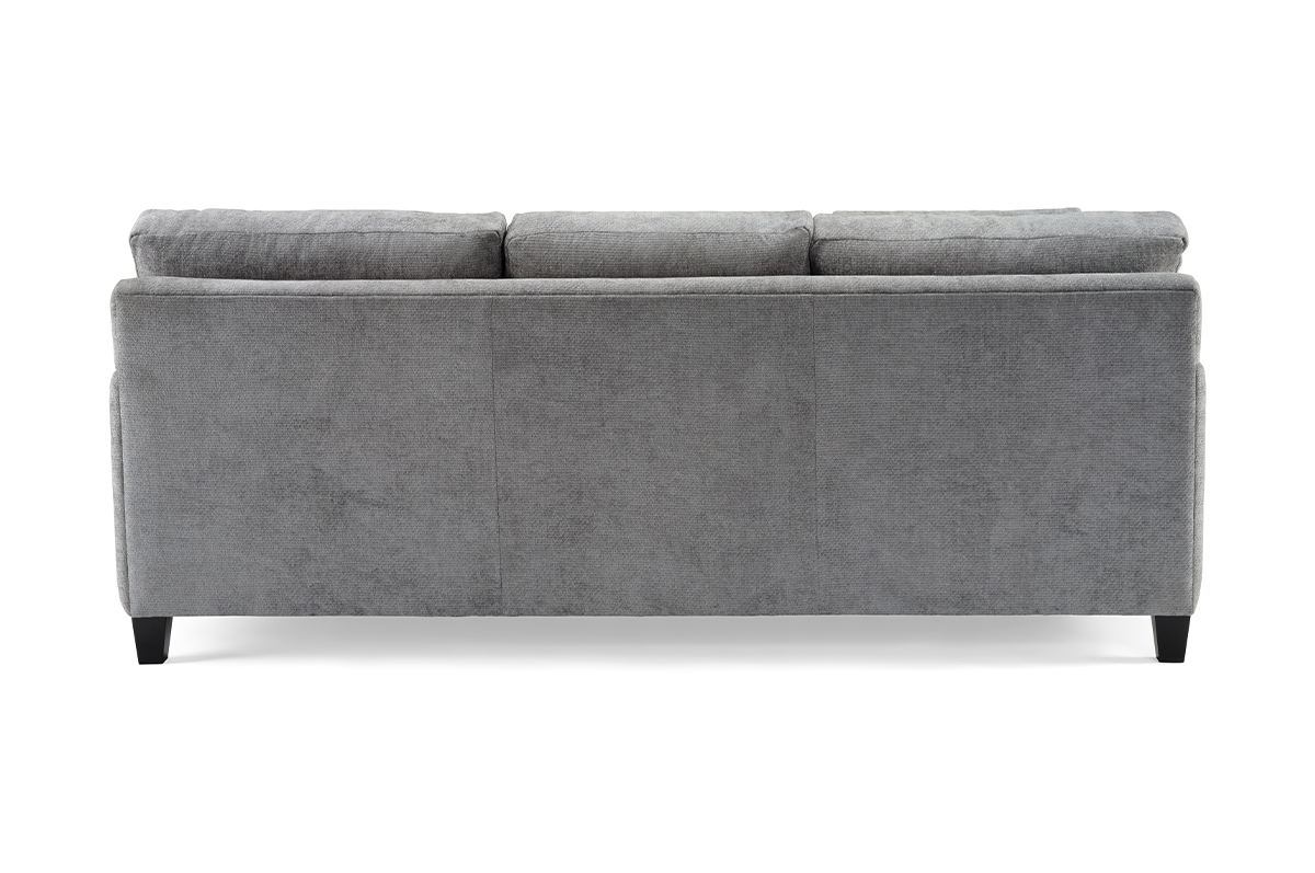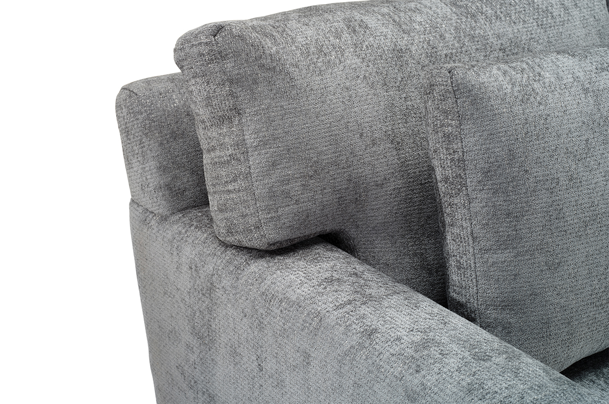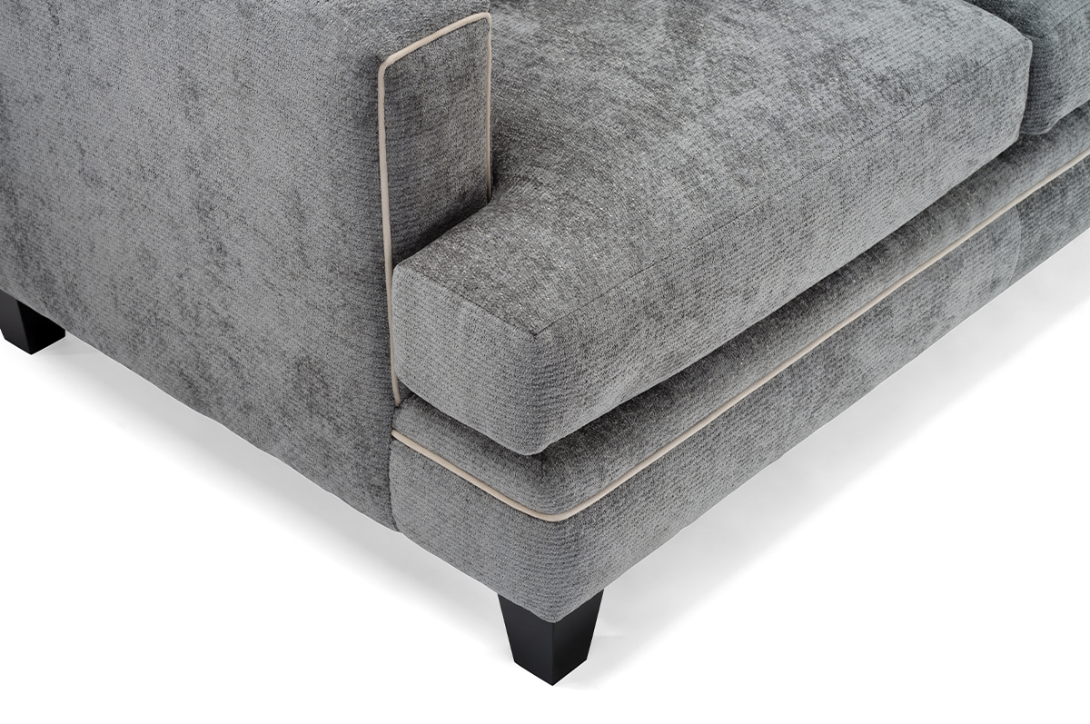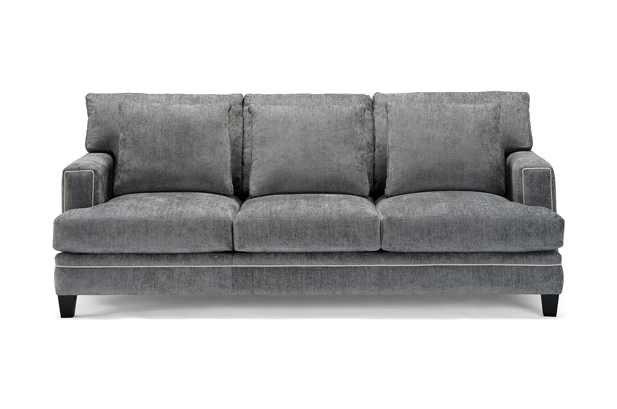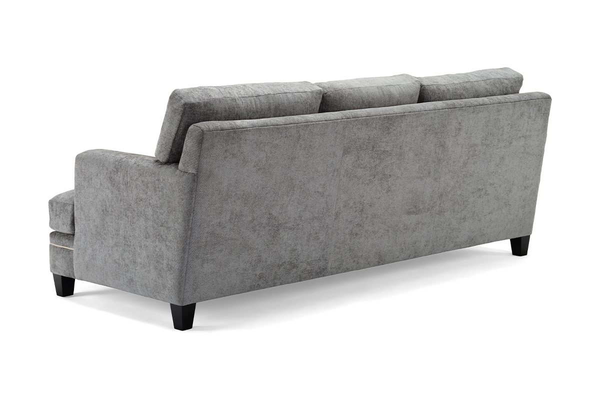 The Chase architectural transitional sofa features 6″ track arms and large rectangular lumbar pillows. It includes exposed tapered wood legs, with nailhead details on the front arm panels and a banded base.