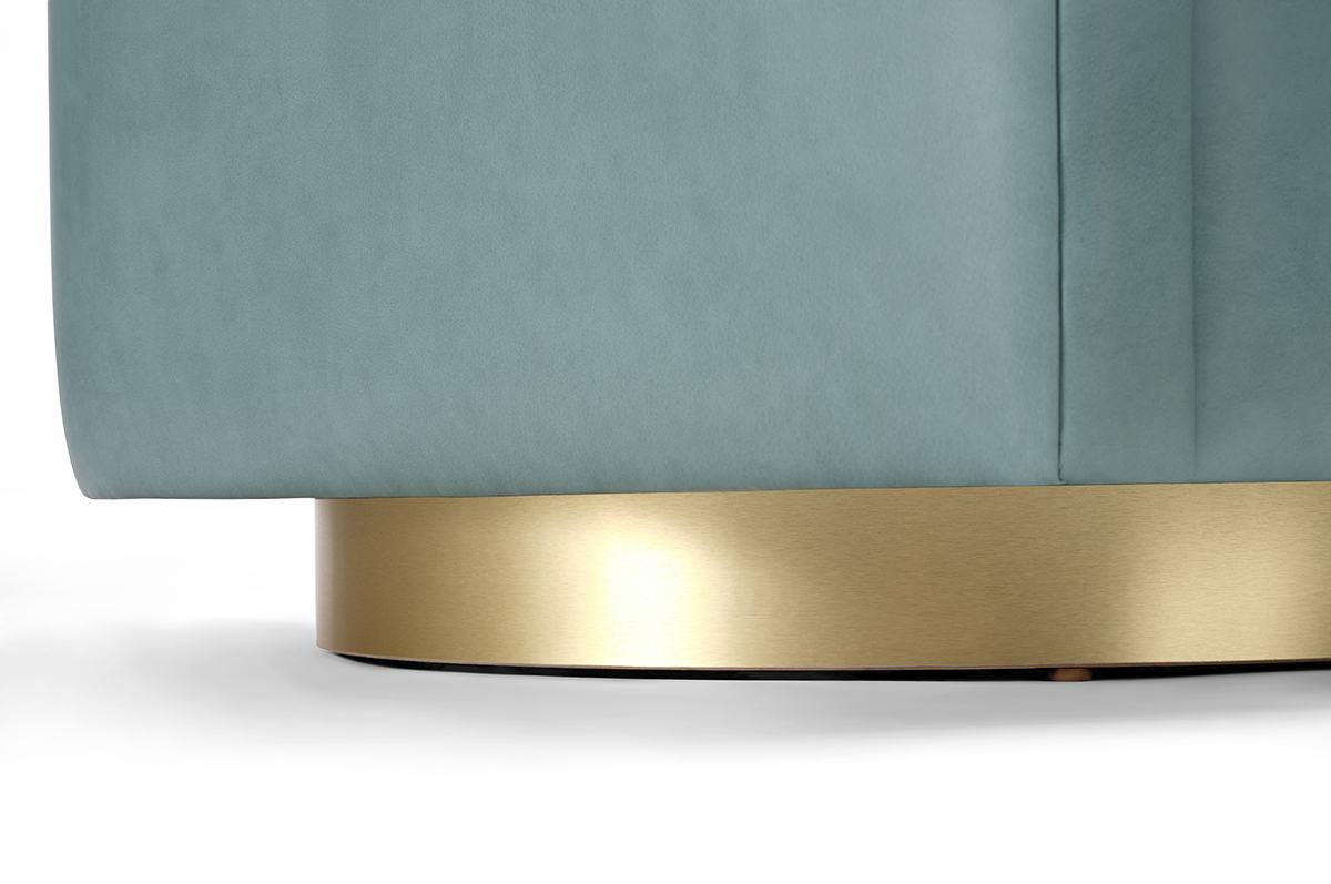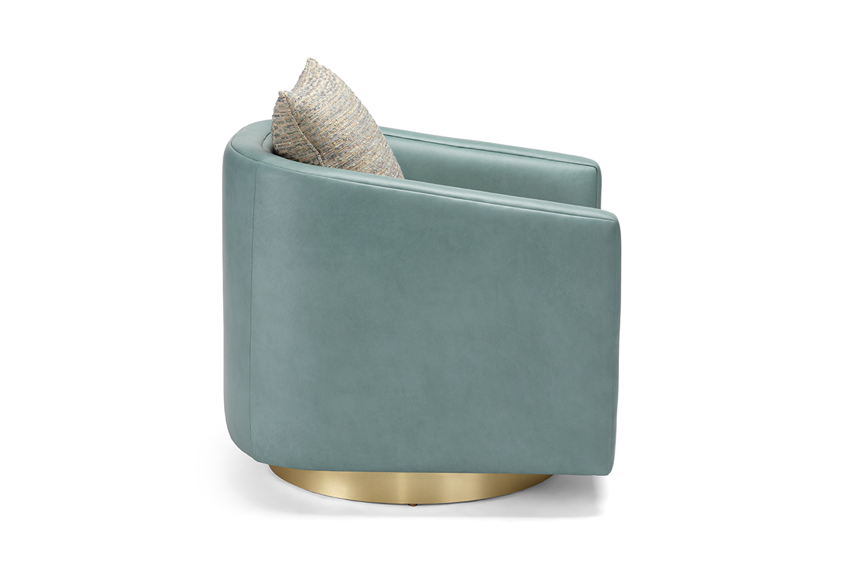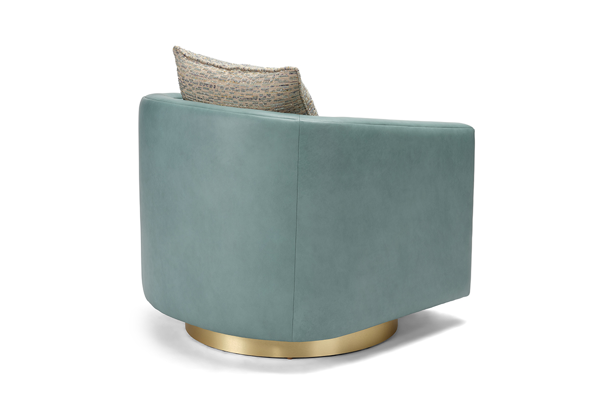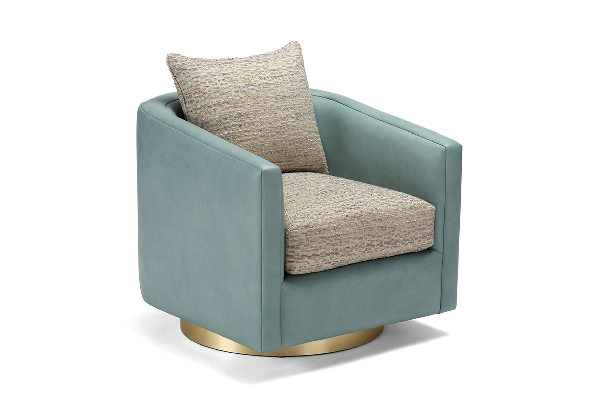 The Ally swivel chair combines classic elegance with a loose seat and back pillow, available with either a wood base or a metal veneer option.