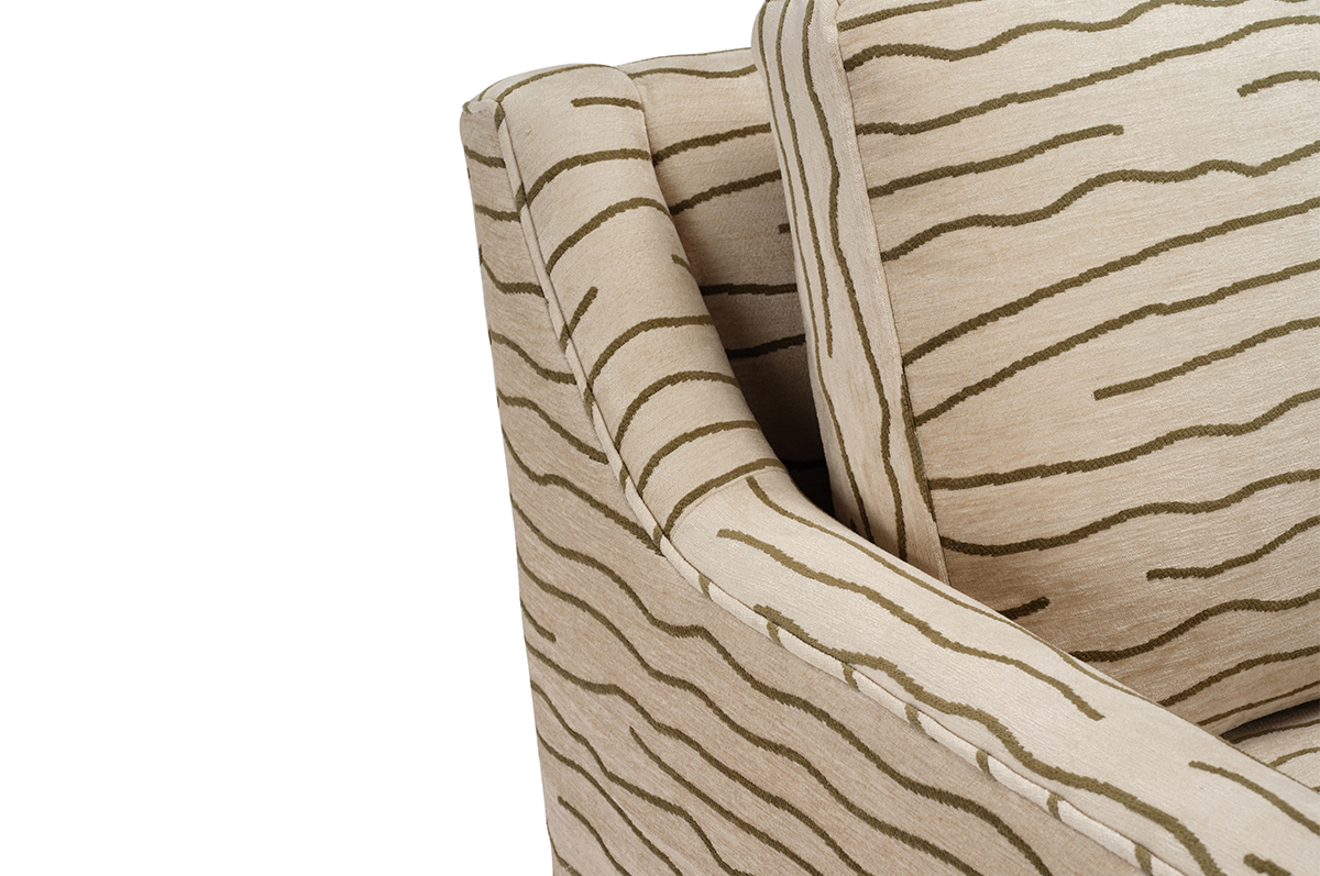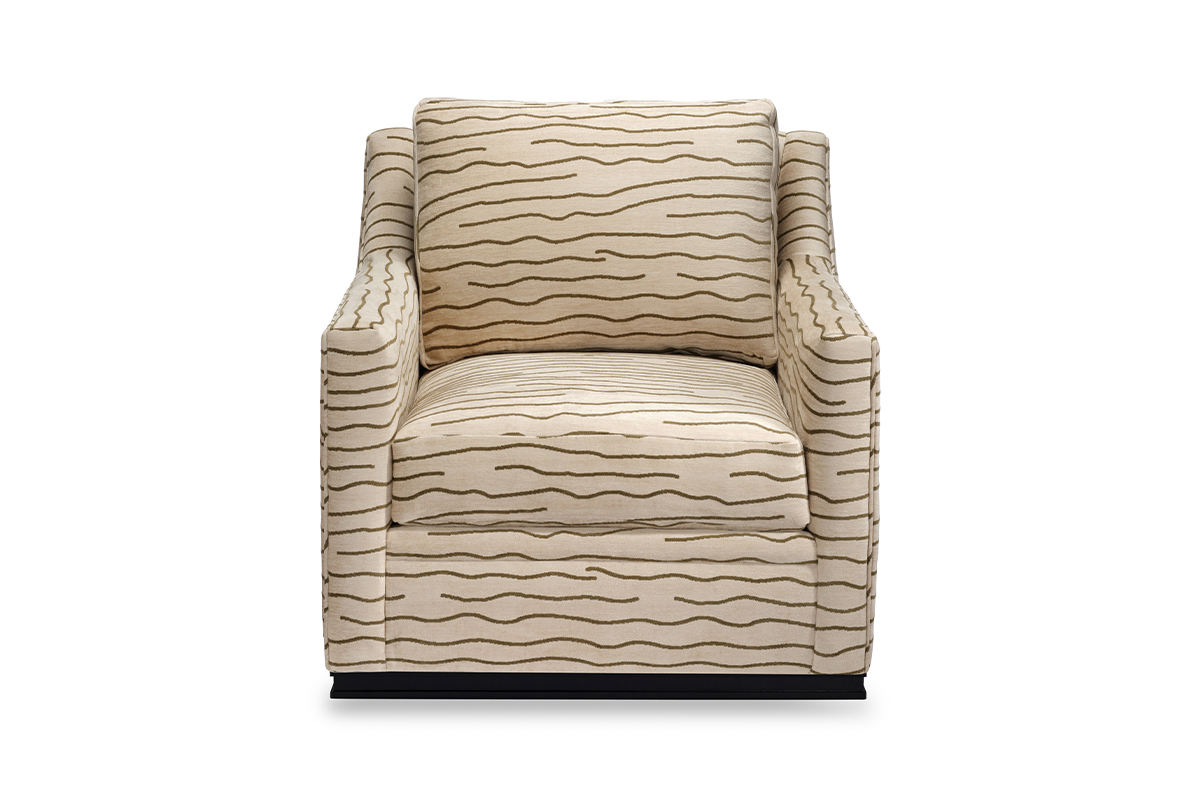 The Zachary swivel chair features classic sloped track arms and a molded wood base, combining timeless design with a touch of sophisticated elegance.