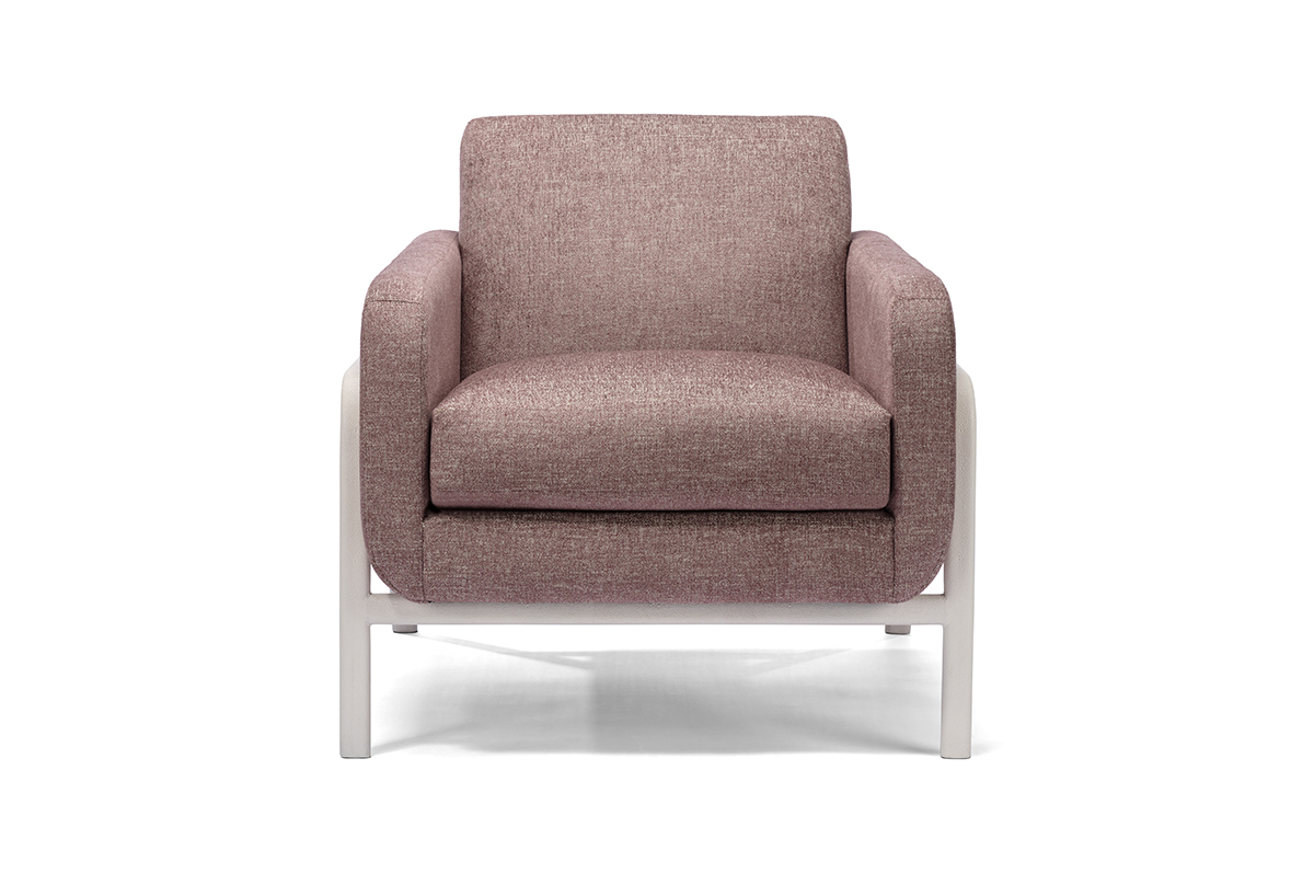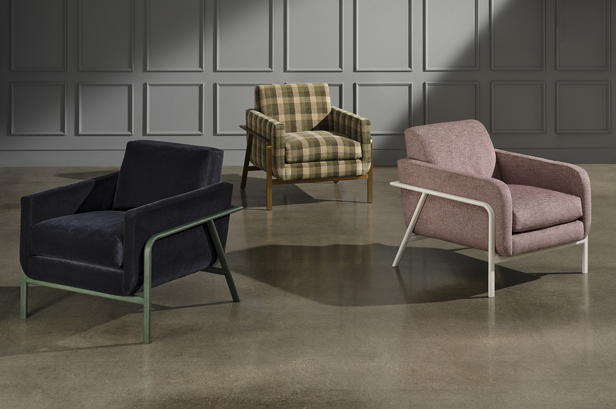 The Lawson Chair features a striking metal frame with a luxurious shagreen finish, complemented by a variety of upholstered interior options for a customized, sophisticated look.
