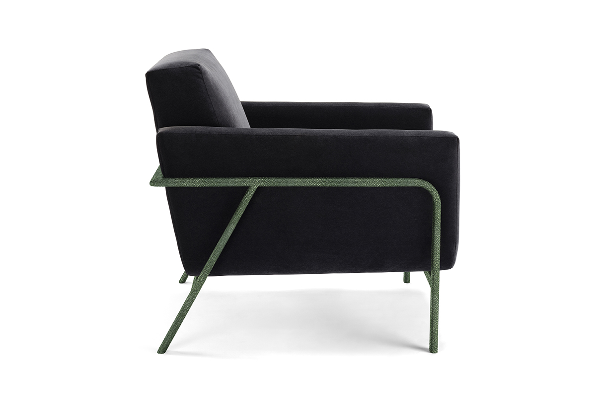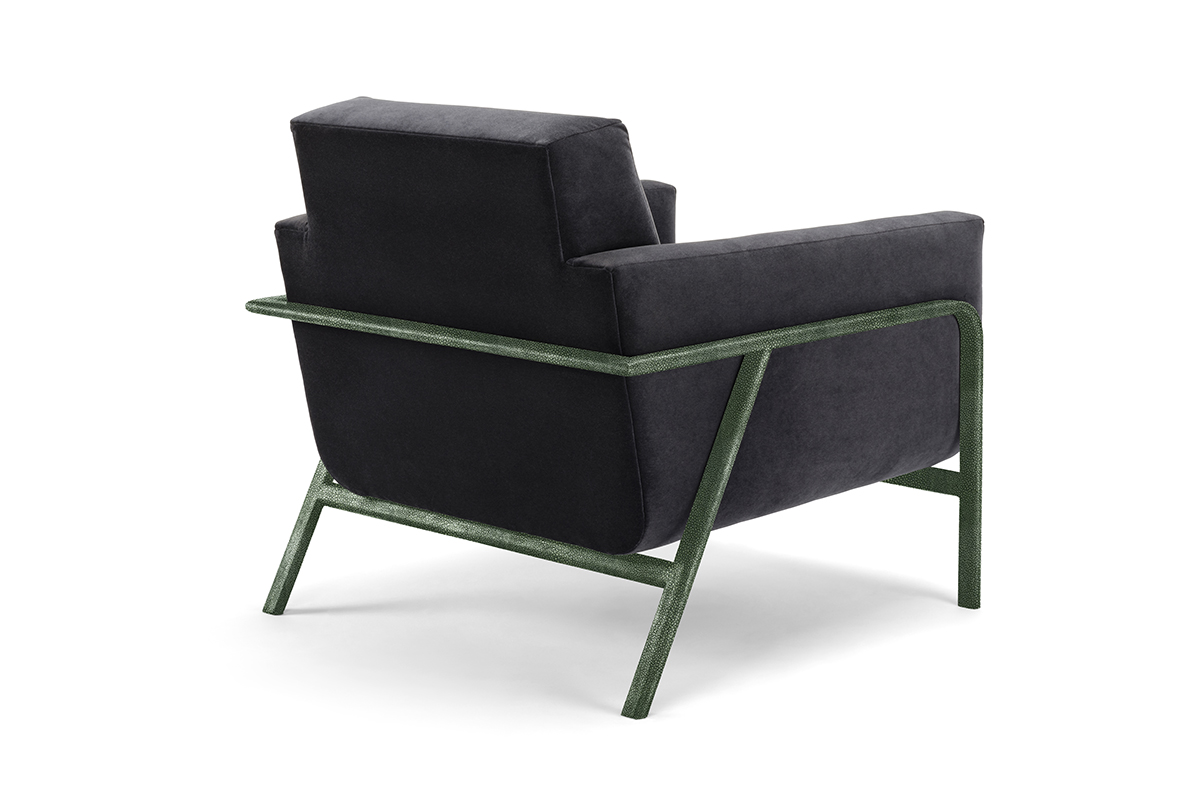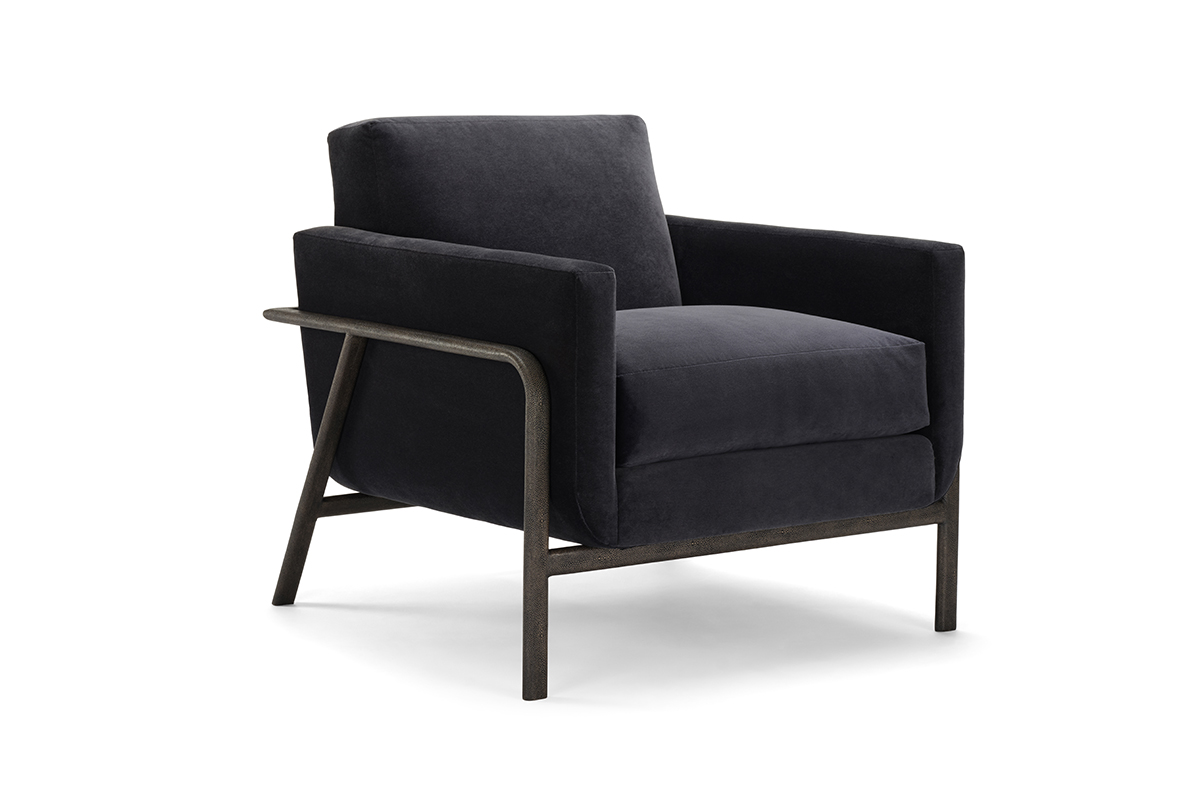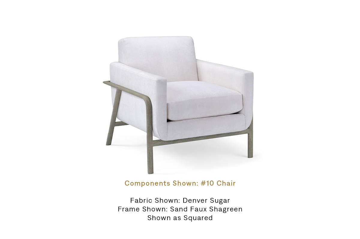 The Lawson Chair features a striking metal frame with a luxurious shagreen finish, complemented by a variety of upholstered interior options for a customized, sophisticated look.