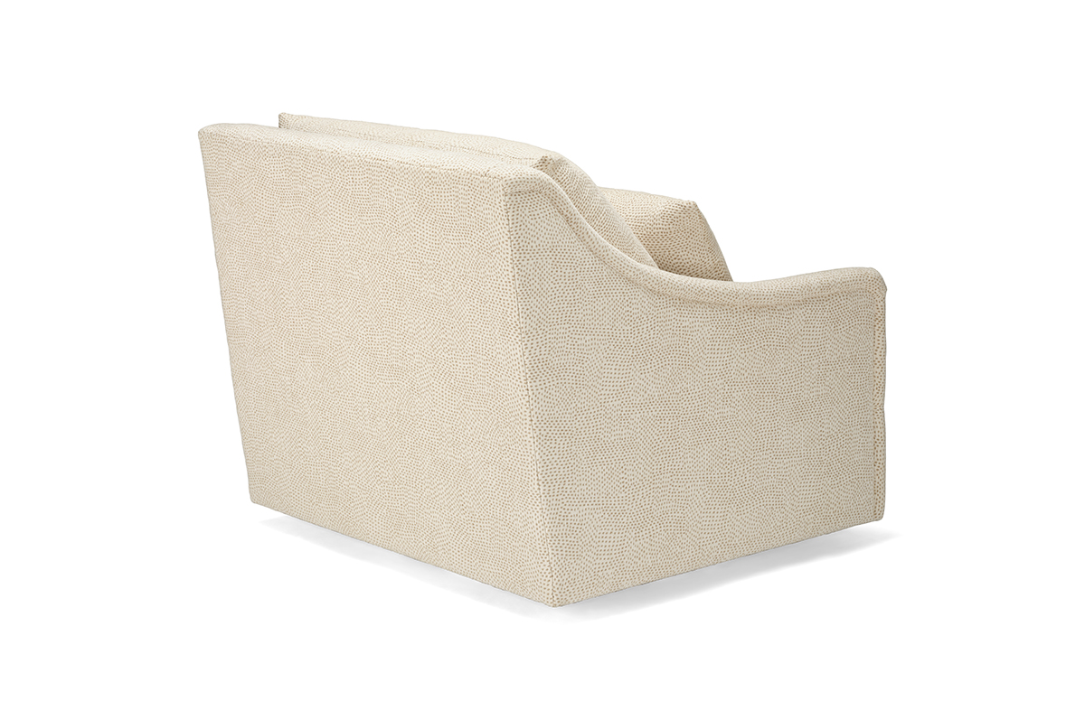 The Grace swivel chair offers a generous scale with loose seat and back cushions, complemented by an added lumbar pillow. A matching storage ottoman is also available to complete the set.