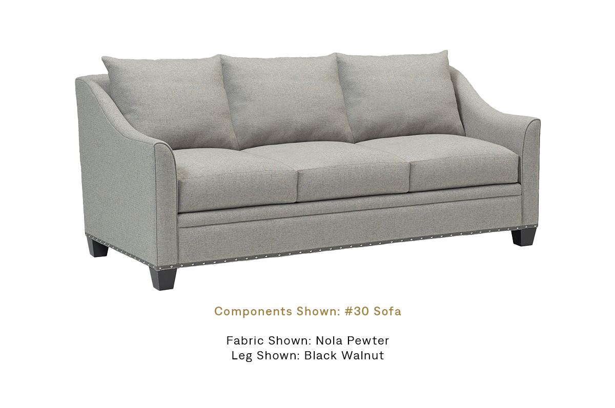 The Lily transitional sofa features thin, sloping track arms and tapered exposed wood legs, offering a refined and stylish look.