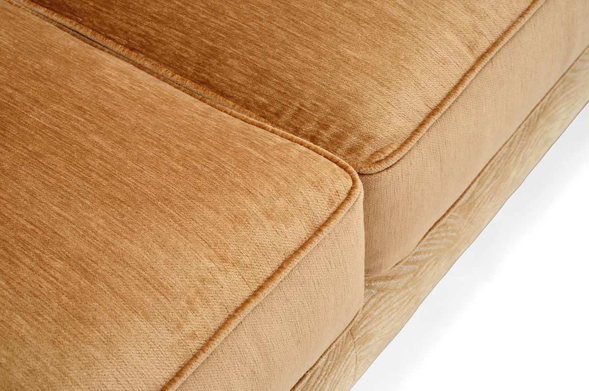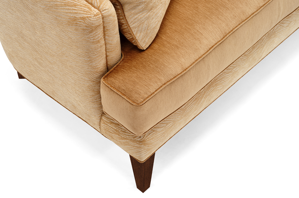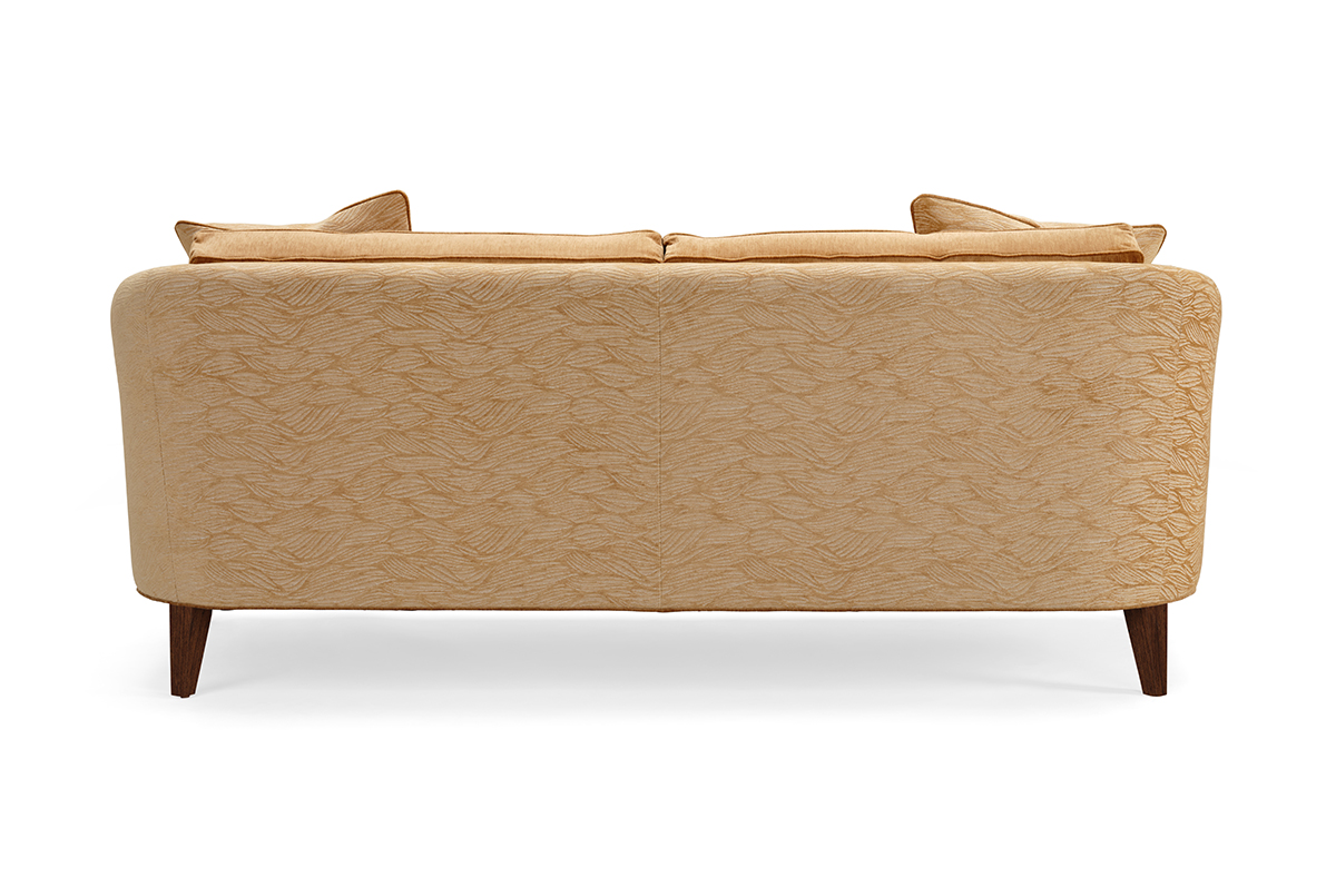 The Leora curved sofa showcases inset welt detailing on the arms and top rail, complemented by high tapered legs for a chic and sophisticated look.