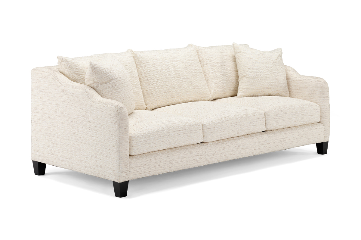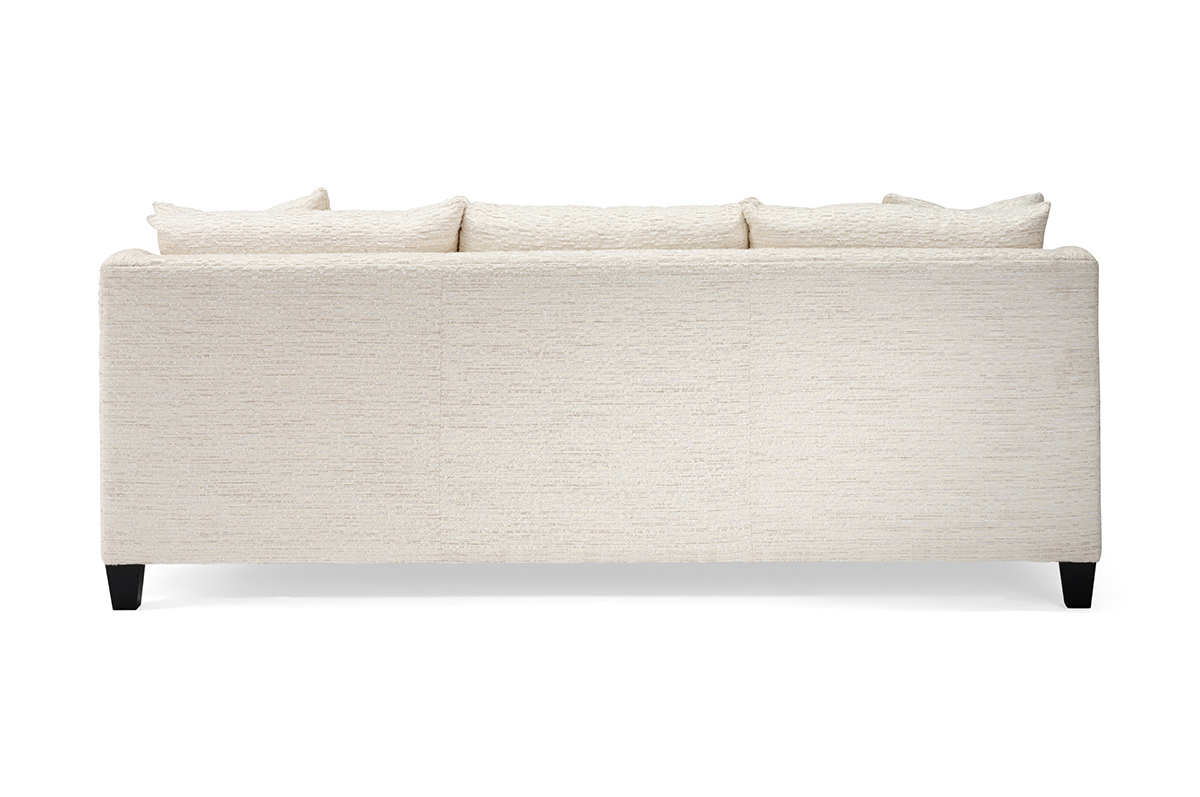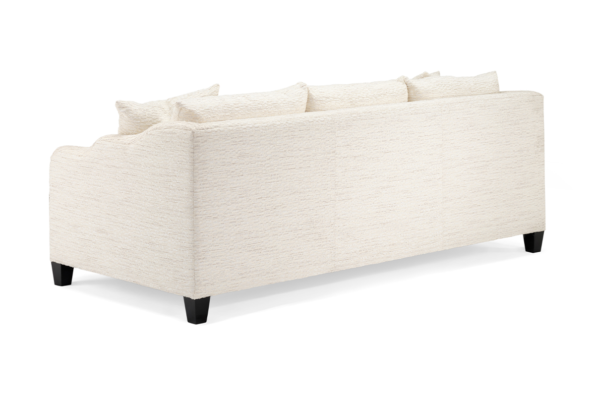 The Maisie sofa brings a contemporary flair to any space, featuring sculptural detailing, a sleek wood base, and plush seat and back cushions for both style and comfort.